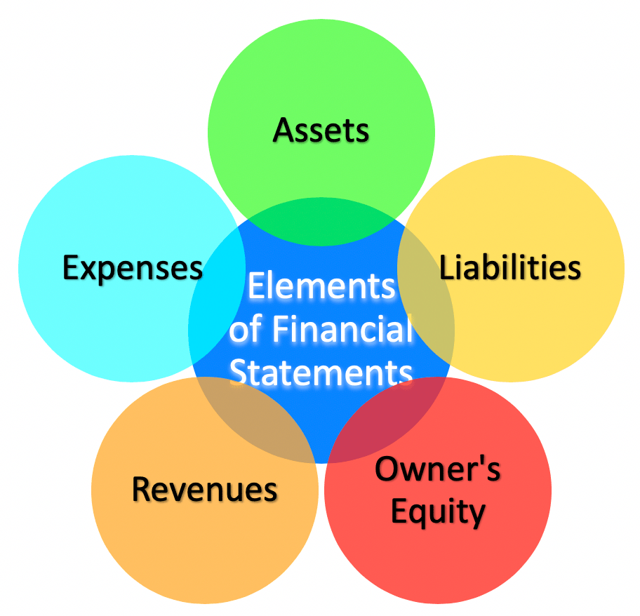 The elements of a financial statement are gotten from the Statement of Financial Position and the Statement of Profit or Loss. The elements are; Revenue, Expenses, Assets, Liabilities, and Owners equity.